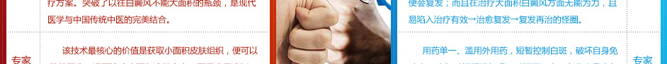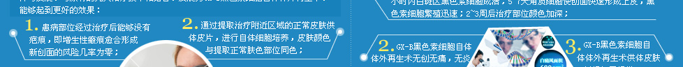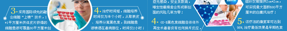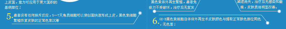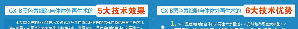 GX-B黑色素细胞自体体外再生术的核心技术便是黑素细胞自体体外再生,与以往的自体表皮移植方法所不同的是,该方法避开了治疗后色素范围扩大现象不明显或过于明显的状况,也突破了自体表皮移植方法一次性治疗面积受限、面积较大的需多次治疗的局限。黑色素细胞自体体外再生便是首先从患者正常皮肤取一片薄的皮片,用Recell一次性独立自体细胞搜集器制成的活细胞悬液培养,促成黑素细胞体外再生,从而"上喷"在创面,从而达到黑素细胞的恢复,迅速使皮肤的正常色素沉着,治疗部位能快速愈合不留瘢痕。痕迹。该技术通过内治与再生疗法,使得白癜风彻底康复的几率大大增强,据目前已使用该疗法的患者临床效果显示,该疗法的康复率达到98%。而且一次使用,目前运用的最大面积可达480平方厘米。而更令患者欢欣的是,该疗法缩短了治疗时间,免除治疗后的感染问题,简便、易行、愈后不留瘢痕,能获得色素恢复和皮损完美愈合的双重功效,同时患者最为关心的复发率上目前观察,复发率几乎为0。