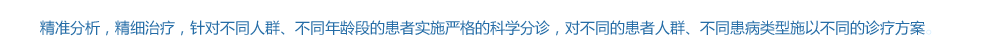 四维分诊模式从白癜风分期、分型、分性立体多角度出发,根据白癜风临床表现、白斑形态、范围、患者性别等多个方面临床反复研究,对不同患者人群、不同患病类型施以不同的诊疗方案。分清白癜风的症状、部位、性质及临床表现、过往治疗史是白癜风治疗的首要关键点。完全颠覆了"千人一方"传统治疗误区这一现象。尤其突出表现在针对不同人群、不同年龄段的患者实施了严格的科学分诊治疗。