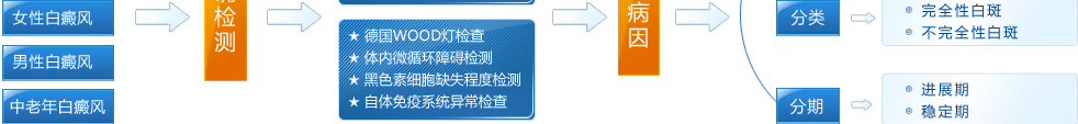 四维分诊模式完全立足全面检查开始,从病因病理开始全程扫描,运用多种国际先进设备对皮肤白斑区域检测,主诊专家和医生根据患者个人的身体状况,从三维白癜风CT检测、德国奥曼wood灯检查、抗黑色素细胞抗体检测、黑色素细胞缺失程度检测、微量元素检测、免疫异常检查检测共7大类20小类近百项检查入手,全面覆盖导致白癜风发病的内因和外因。